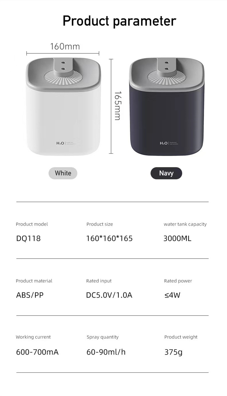 Product selling points: simple appearance; Replaceable atomizer, worry free after sales; Double injection / single injection mode; Large capacity 3L water tank; Colorful night light